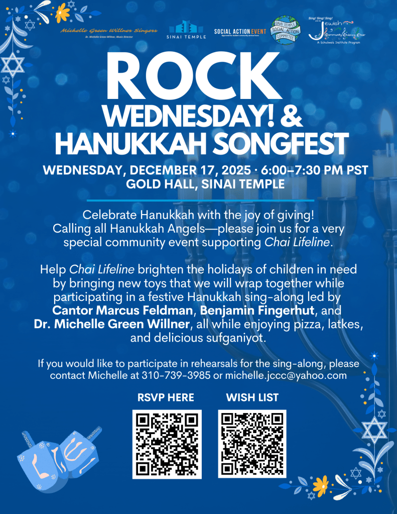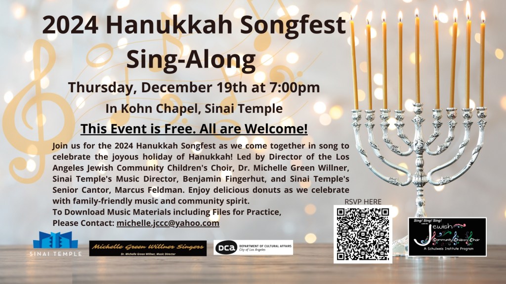 Hanukkah Songfest at Sinai Temple: Wed. December 17th; 6-7:30pm Gold Hall.