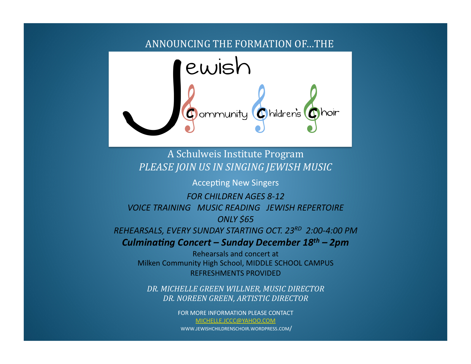 Welcome to the new Jewish Community Children’s Choir Posted on September 23, 2011October 14, 2011 by jewishchildrenschoir For more information, click here to email MICHELLE.JCCC@YAHOO.COM